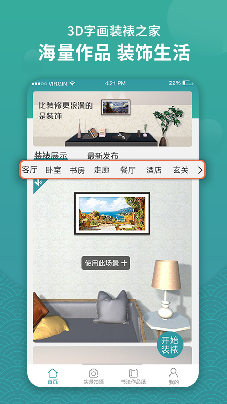 这款软件的核心亮点在于其强大的3D模拟功能。用户无需具备专业的设计背景,也能通过简单的操作,将心仪的字画作品以逼真的3D效果融入自家的客厅、书房、卧室或走廊等场景。软件内置了多达几十种精美的装裱样式,从古典雅致到现代简约,应有尽有,满足不同用户的审美需求。同时,上百种风格的房屋场景供用户模拟体验,包括现代风、欧美风、地中海风等,帮助用户直观感受装裱作品在不同装修风格中的视觉效果,实现美感与功能的完美结合。
